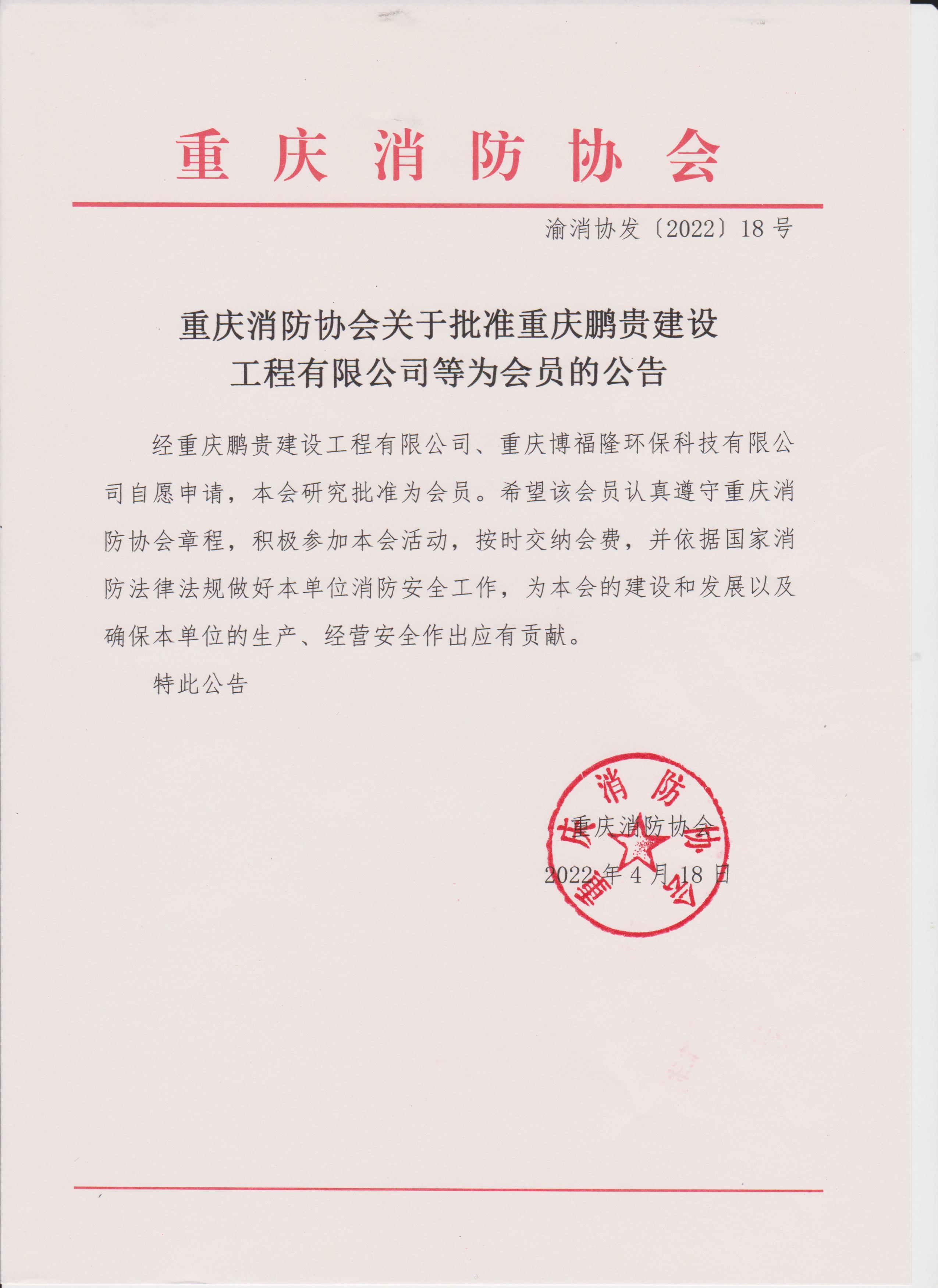 星空app官网关于批准重庆鹏贵建设工程有限公司等为会员的公告