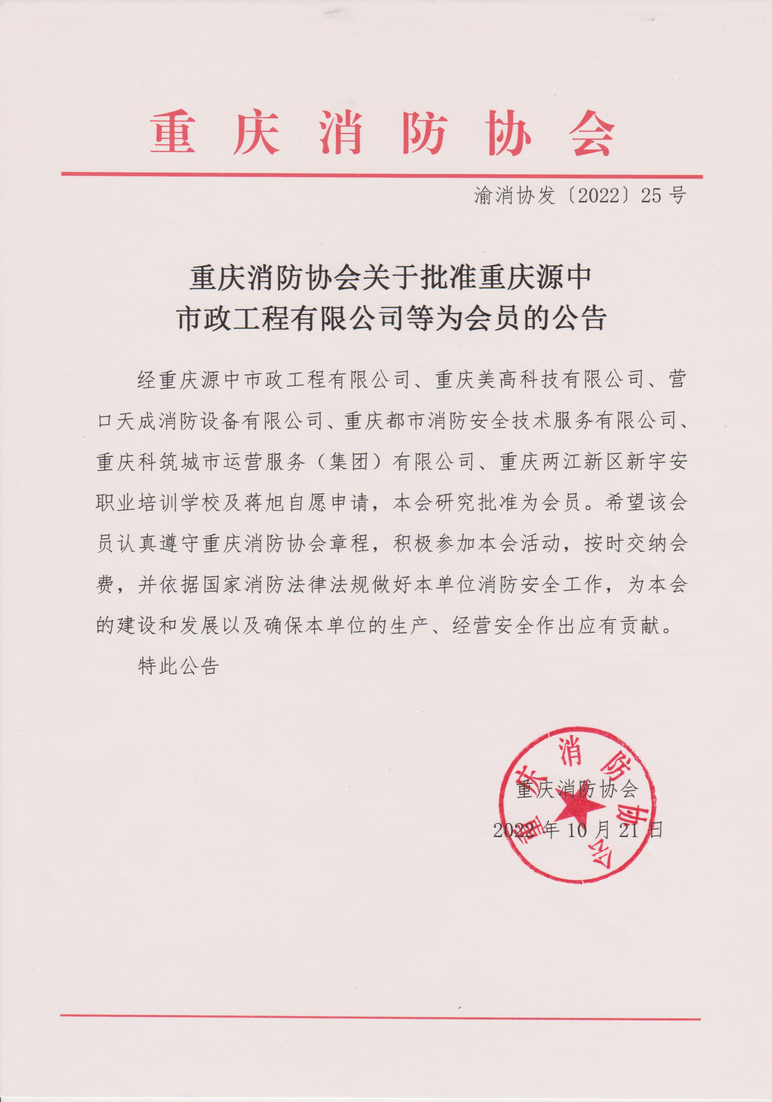 星空app官网关于批准重庆源中市政工程有限公司等为会员的公告