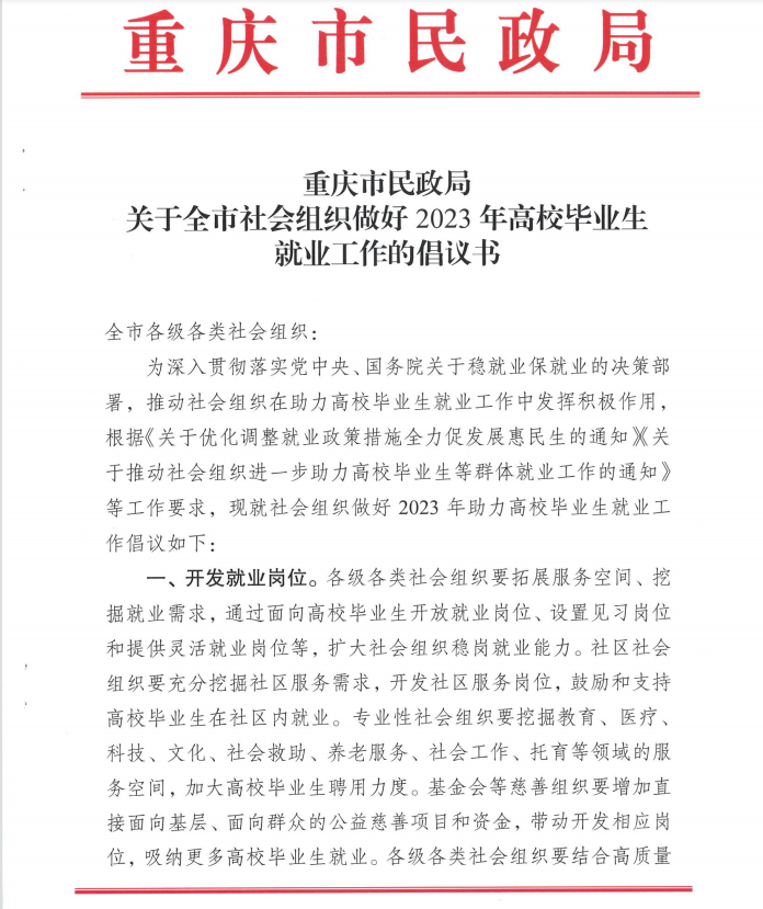 转发重庆市民政局关于全市社会组织做好2023年高校毕业生就业工作的倡议书