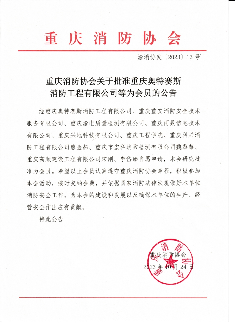 星空app官网关于批准重庆奥特赛斯消防工程有限公司等为会员的公告
