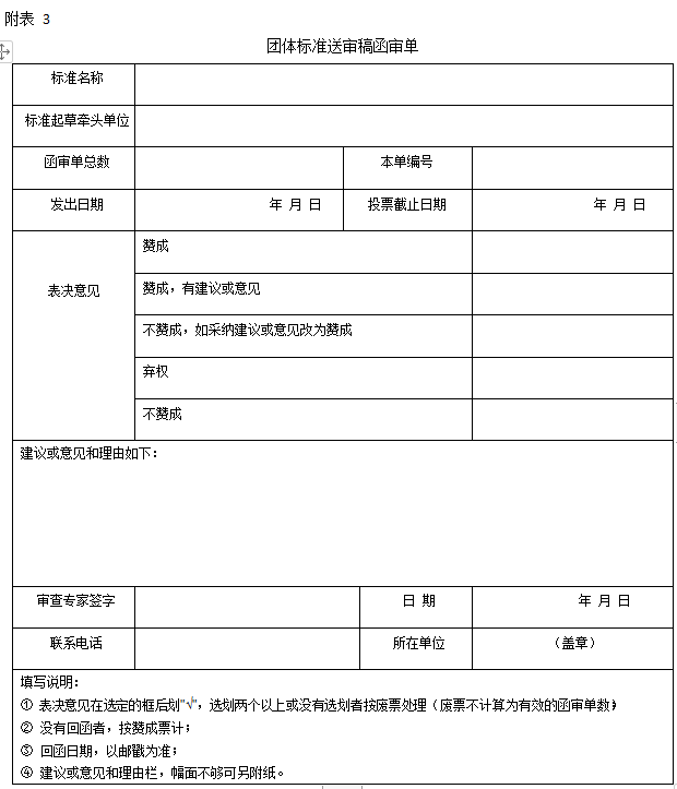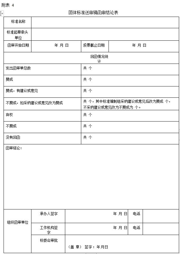 第二十三条 标准审查形式一般采用会议审查(简称会审),会审应有审查结论。必要时也可以采用发函审查(简称函审),函审应填写《团体标准送审稿函审单》(见附表3)和《团体标准送审稿函审结论表》(见附表4)。