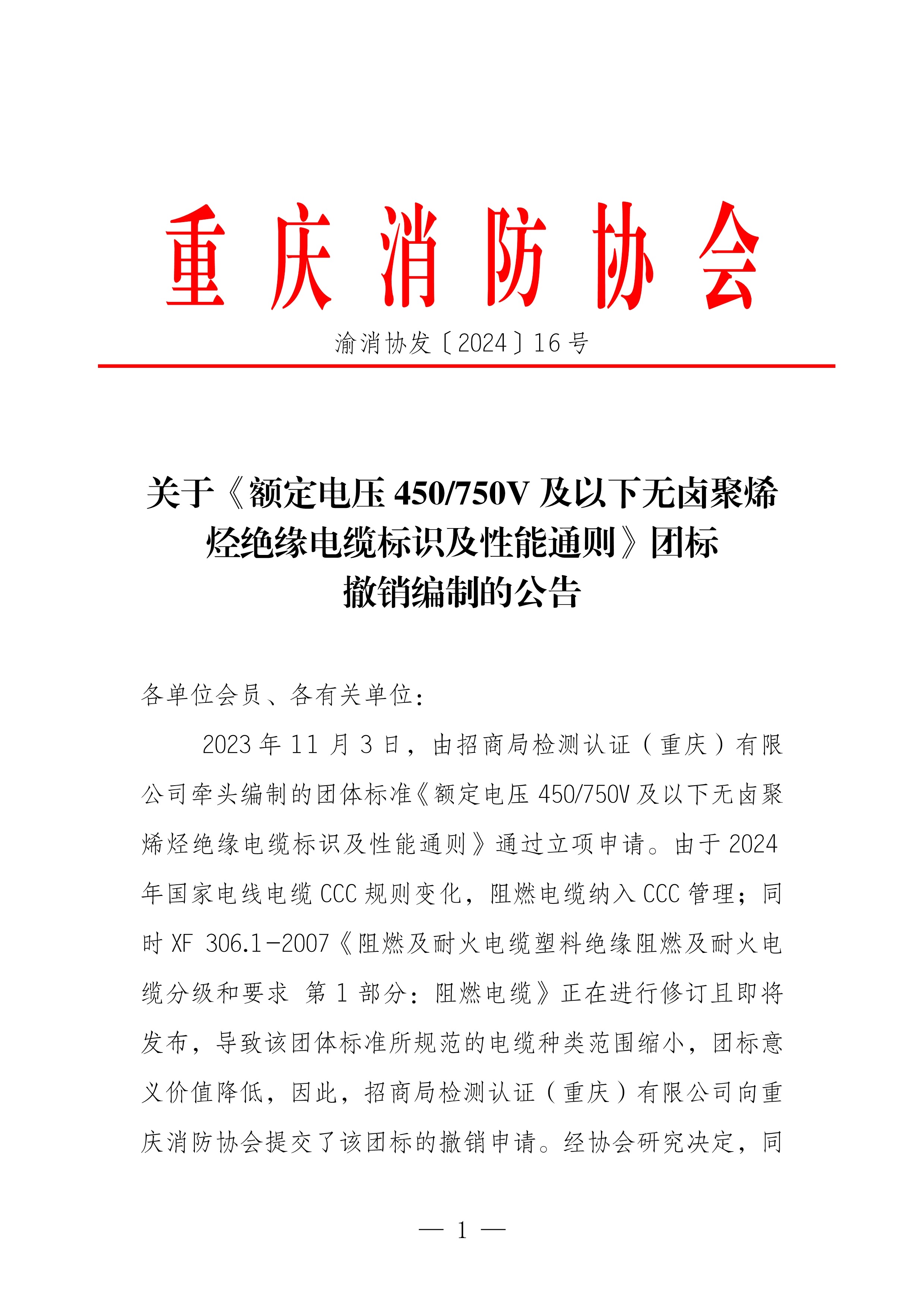 关于《额定电压450/750V及以下无卤聚烯烃绝缘电缆标识及性能通则》团标撤销编制的公告