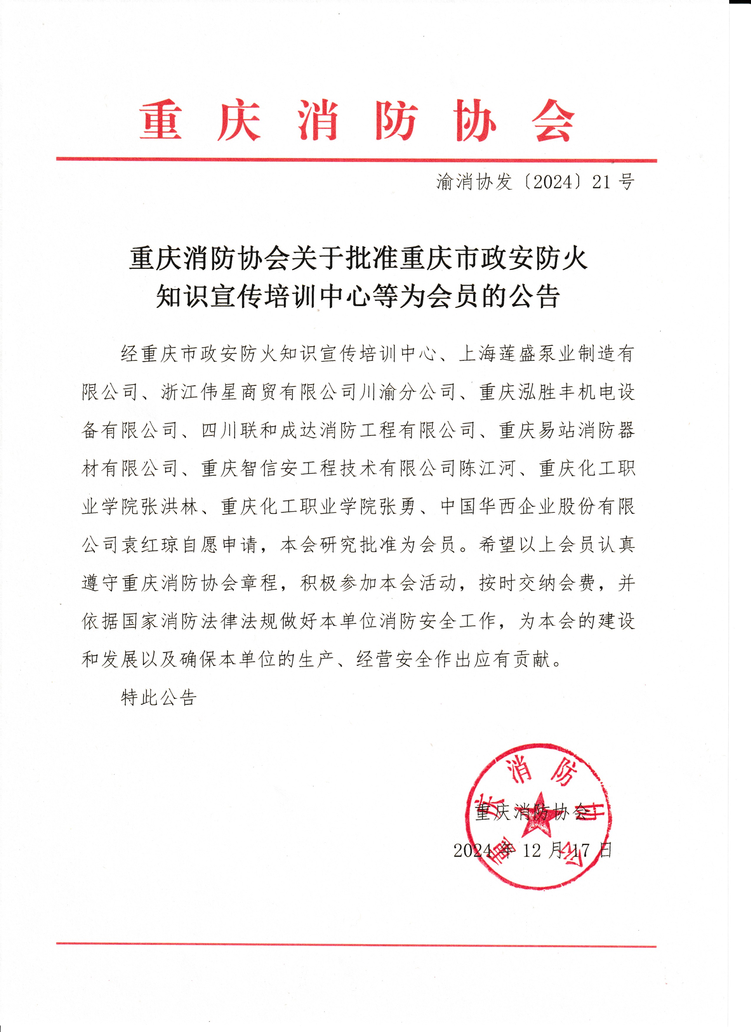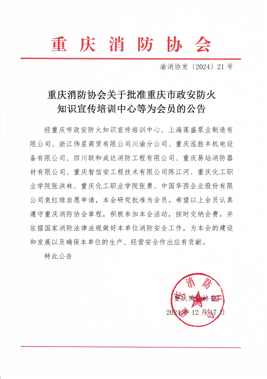 星空app官网关于批准重庆市政安防火知识宣传培训中心等为会员的公告