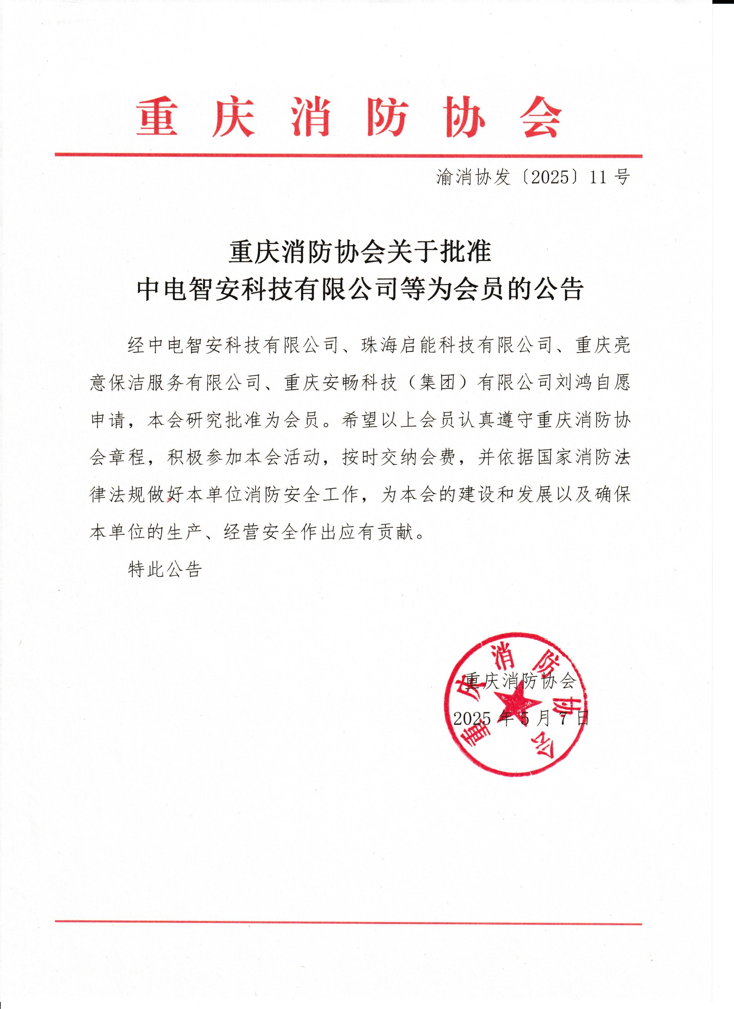 星空app官网关于批准中电智安科技有限公司等为会员的公告